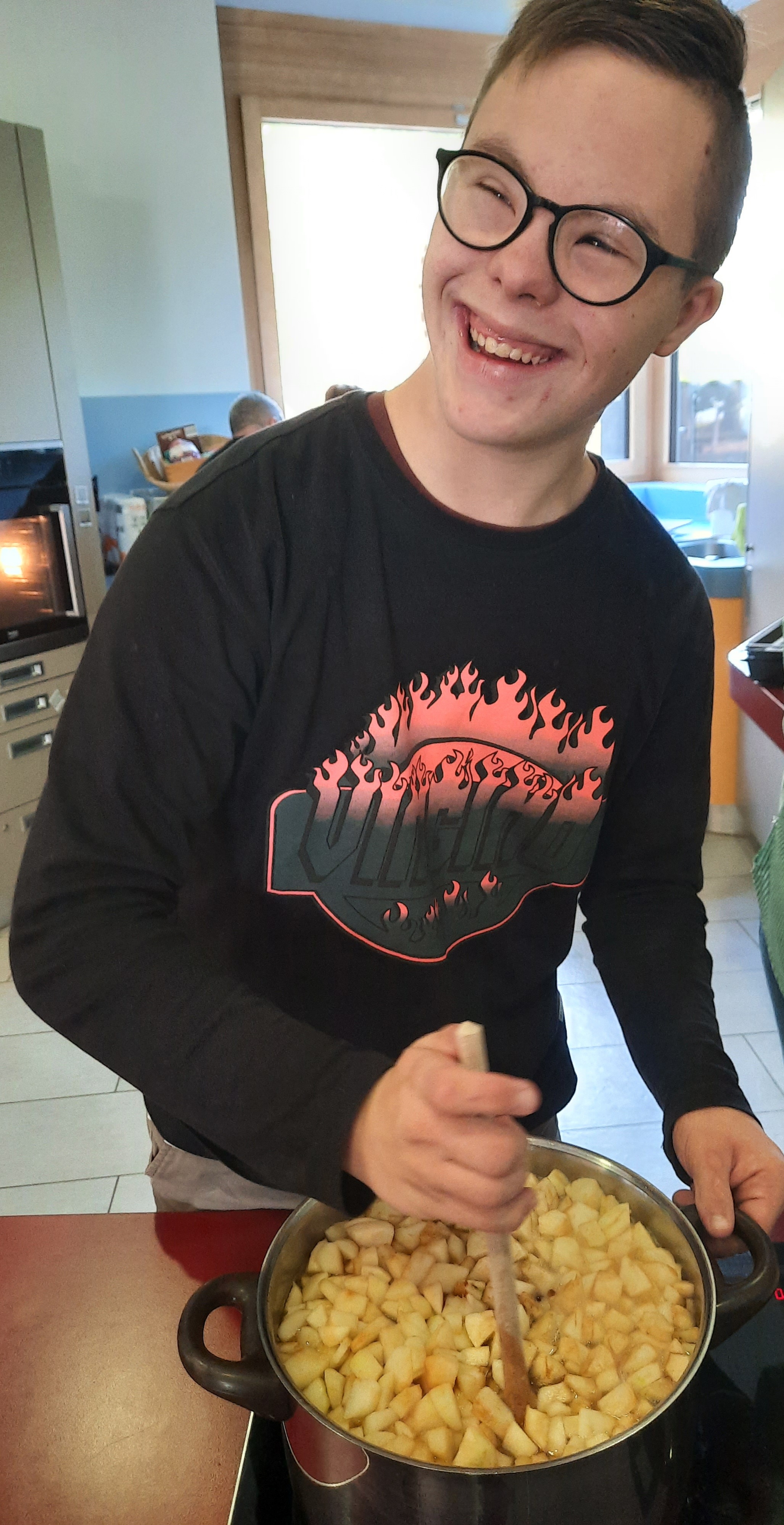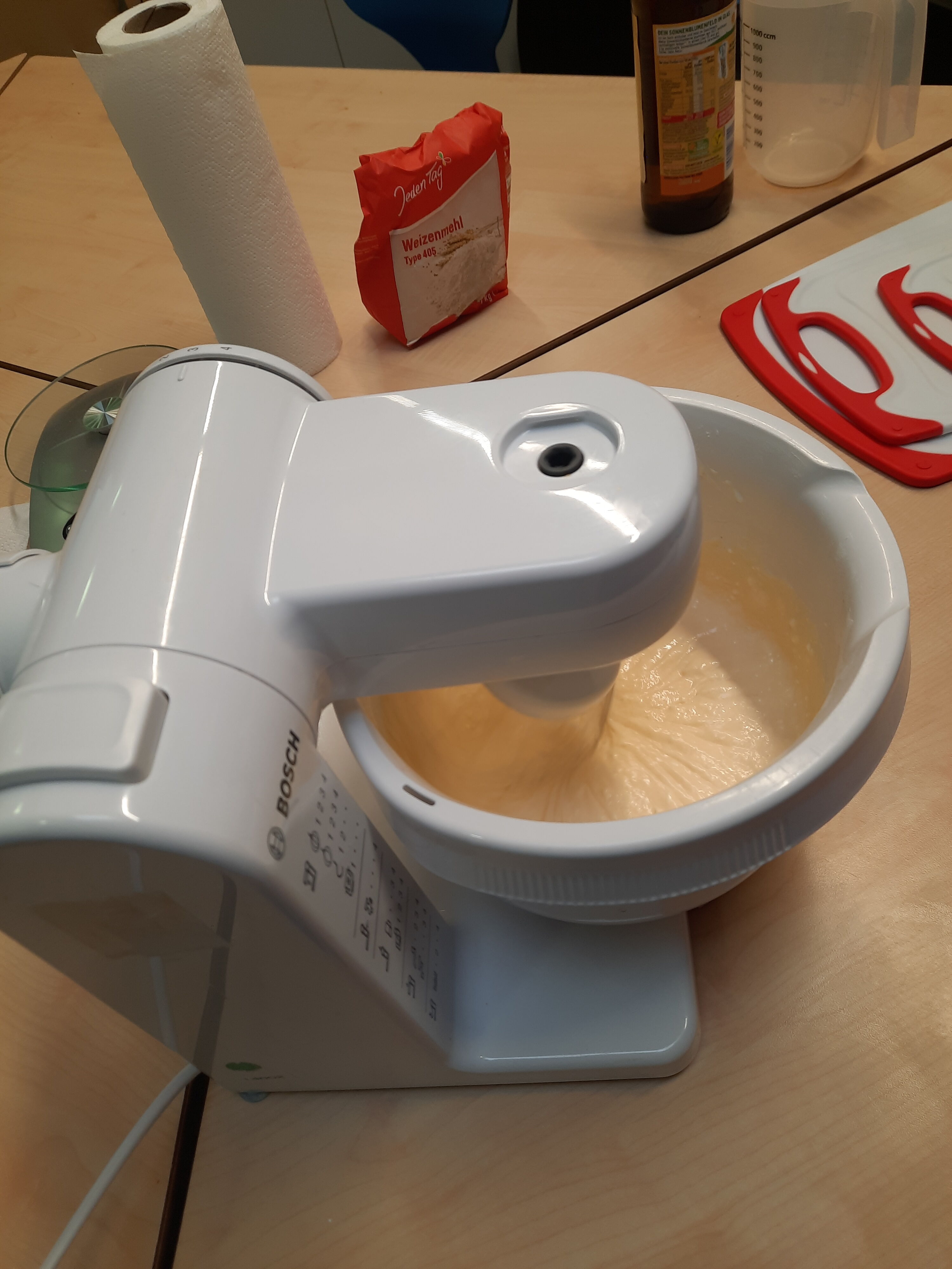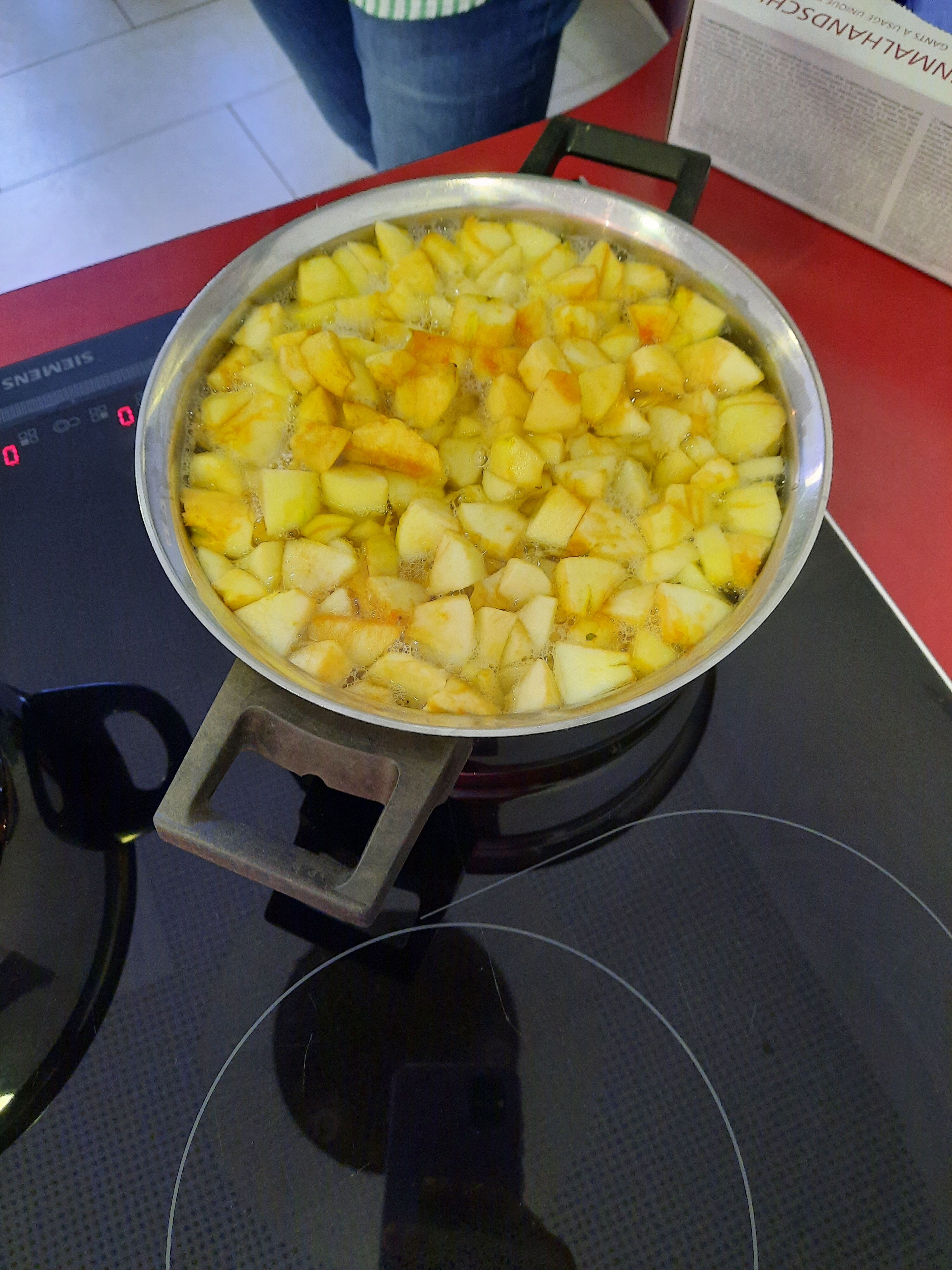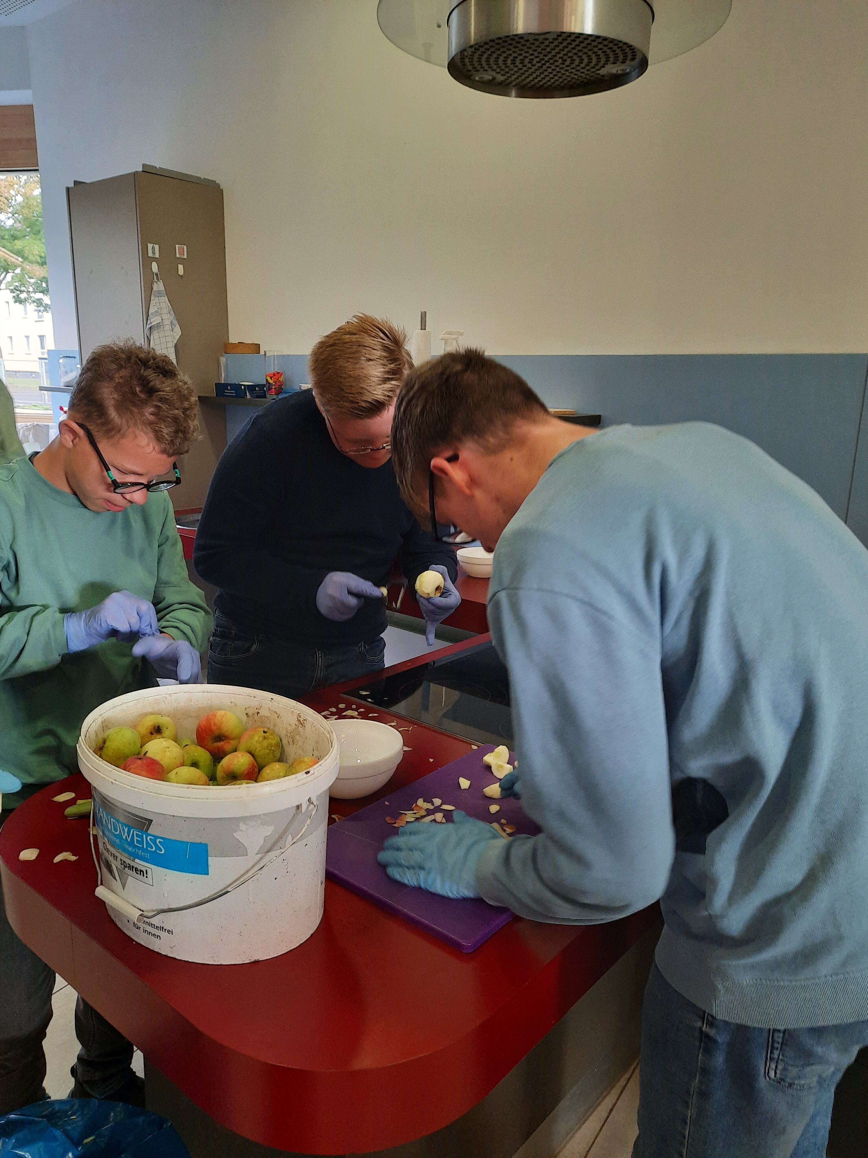 Während dessen hat die andere Gruppe das Tiramisu zubereitet und dazu brauchte man Joghurt, Äpfel und Kekse. Aus den Äpfeln musste erstmal Mus werden, die Äpfel mussten wie bei den Muffins geschält, entkernt und auf Brettchen klein geschnitten werden. Eine Frage war: „Wie macht man den Kern weg?“ Die Lehrer haben es dann gezeigt oder auch geholfen und die geschnittenen Äpfel mussten im heißen Wasser mit Zitronensaft weichgekocht werden, damit es dann püriert werden konnte. Bei dem Pürieren hat ein Schüler den Behälter gehalten und der andere hat püriert. Zum Schluss landete der noch warme Apfelmus mit den Keksen und dem Joghurt geschichtet in der Auflaufform.