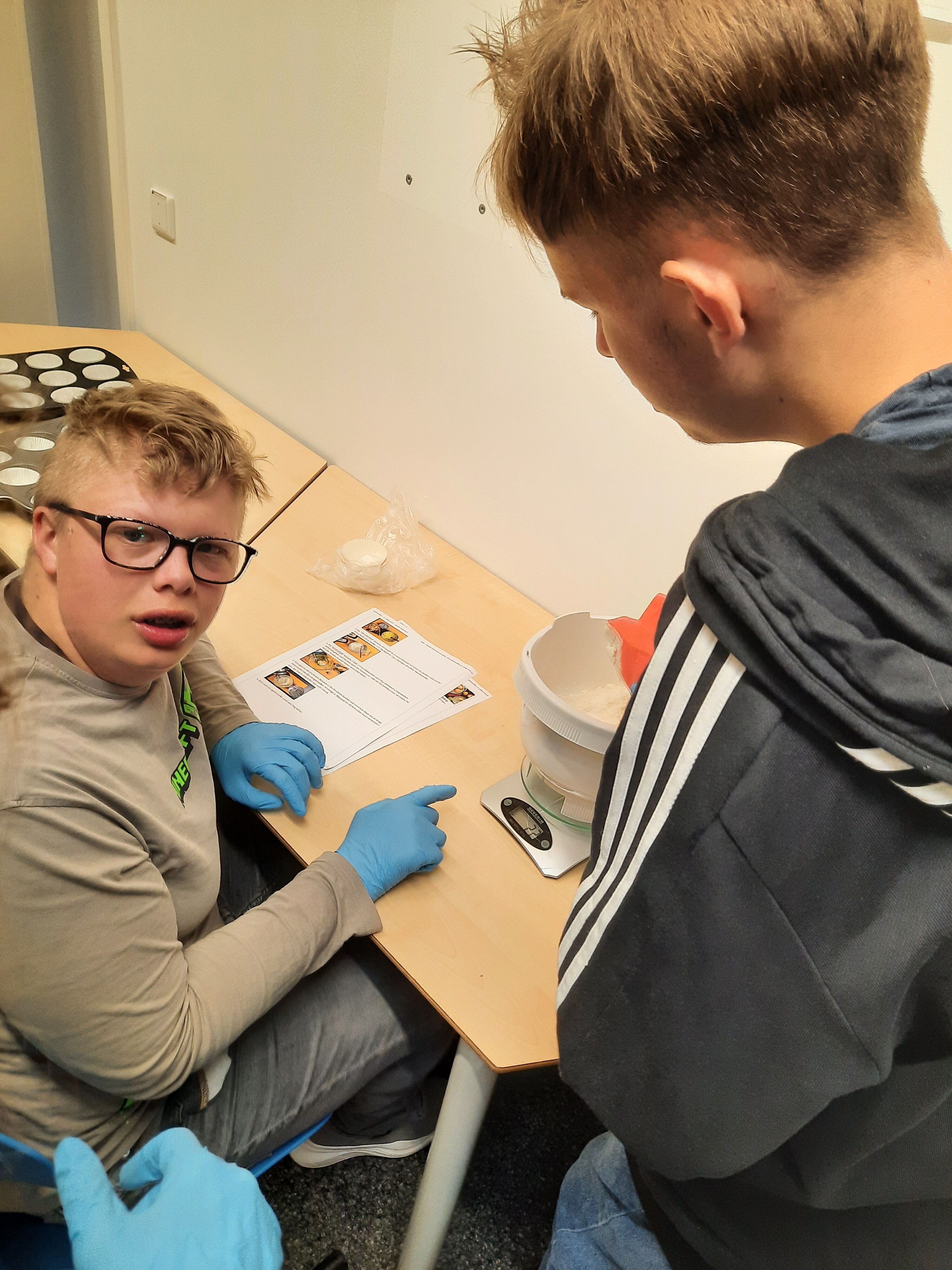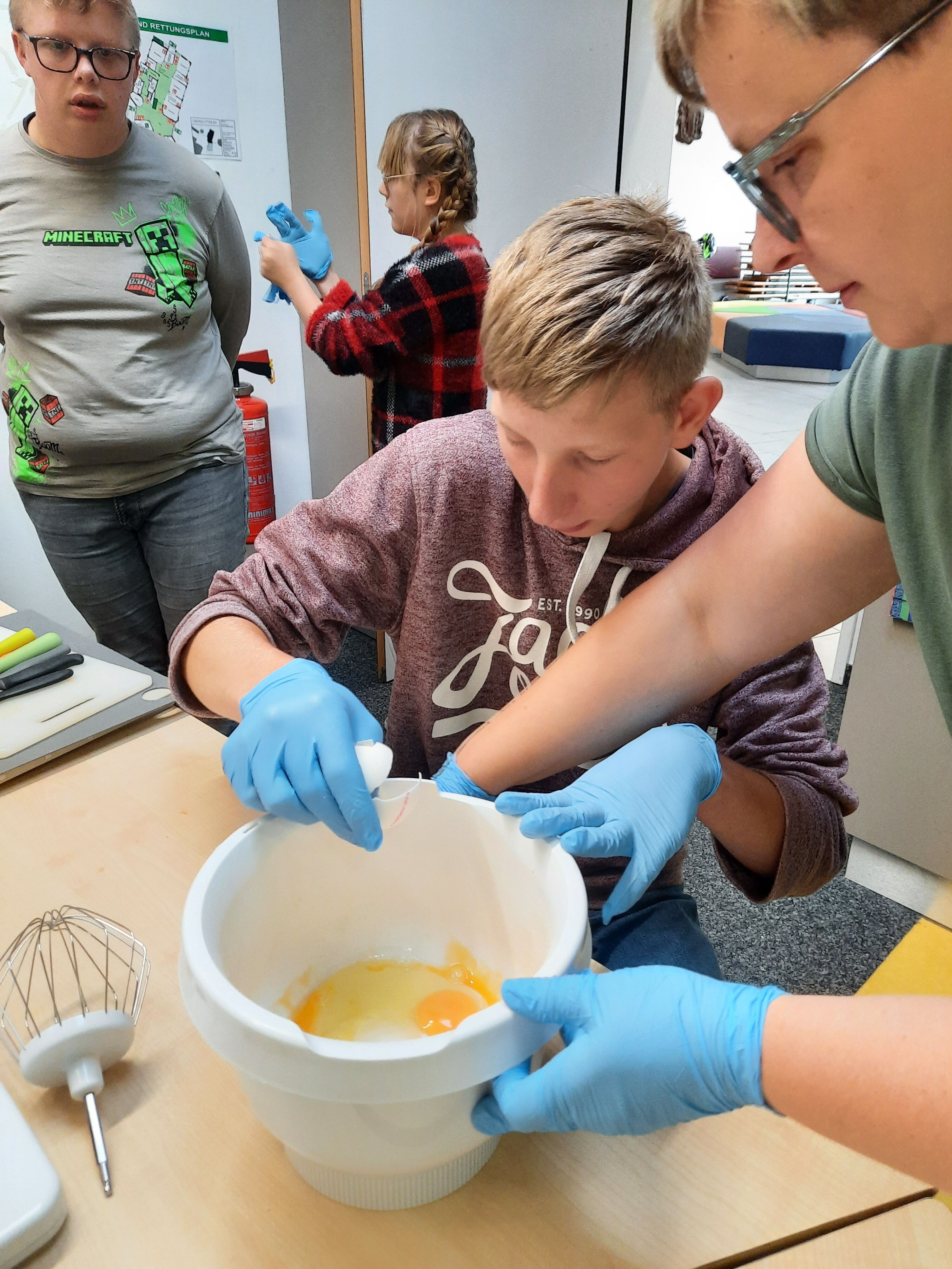 Die Schüler und Schülerinnen der Hauptstufe haben Apfeltiramsu und leckere Apfelmuffins an einem Vormittag gebacken. Die Lehrerinnen haben alle Zutaten für das Vorhaben besorgt und dann mitgebracht. Für den Vormittag war unsere Küche blockiert und es zogen leckere Gerüche durch das Schulgebäude. Aber zurück zum Anfang, denn die Leckereien backen sich ja nicht von selbst. Ausgedruckt und mit Bildern versehen lag das Rezept auf dem Küchentresen, sodass jeder drauflinsen konnte. Die Hauptstufe wurde in zwei Gruppen aufgeteilt, die eine hat Muffins gebacken und die andere hat Tiramisu gemacht. Zuallererst haben die Jugendlichen die Zutaten, die auf dem Küchentresen lagen, benannt. Damit keiner etwas doppelt sagte oder sich orientieren konnte, hat die Lehrkraft auf die bestimmte Zutat gezeigt und in die Runde gefragt: „Wisst ihr, was das ist?“ Natürlich wurde untereinander geholfen und die richtige Antwort ins Ohr geflüstert.