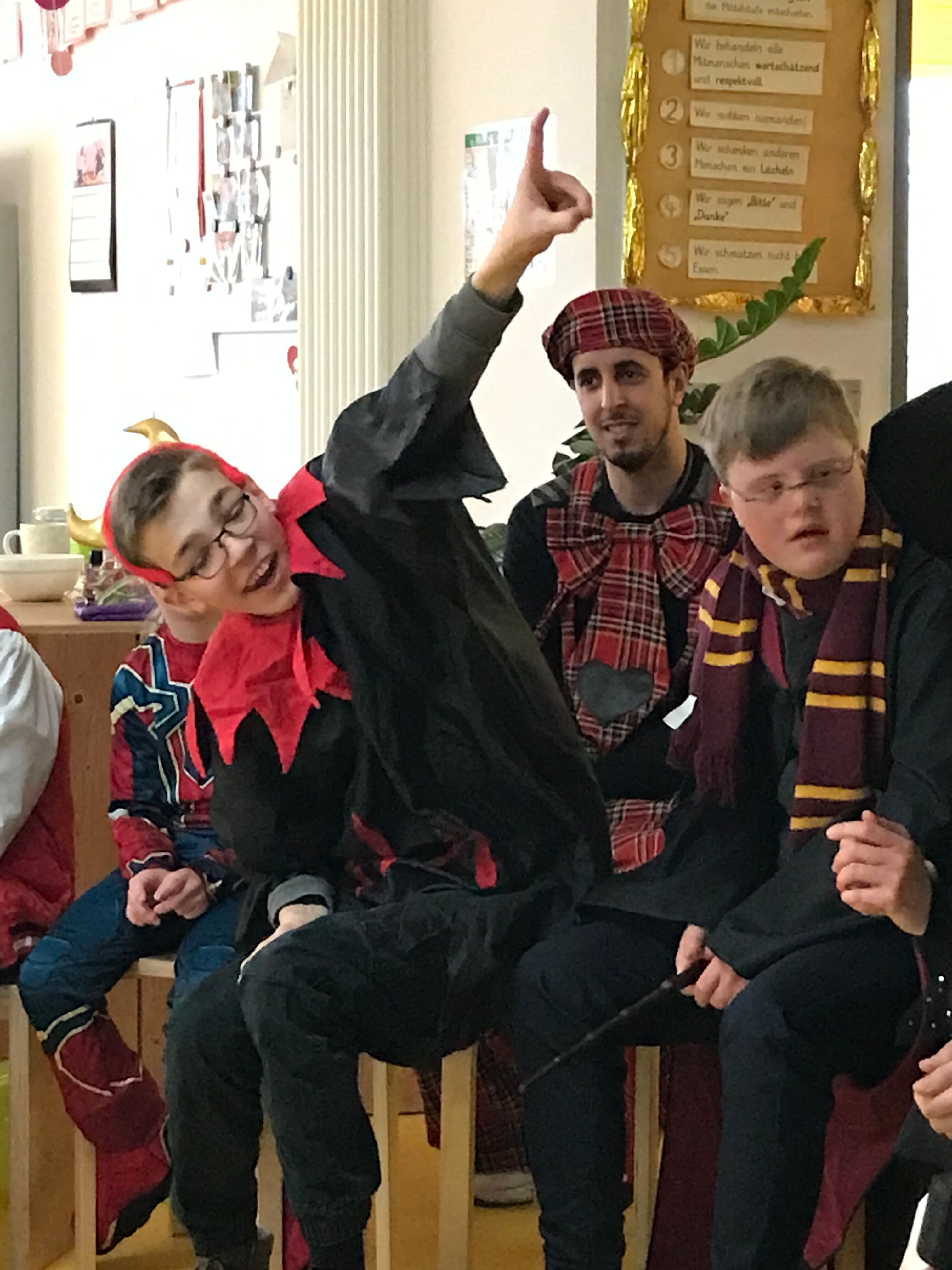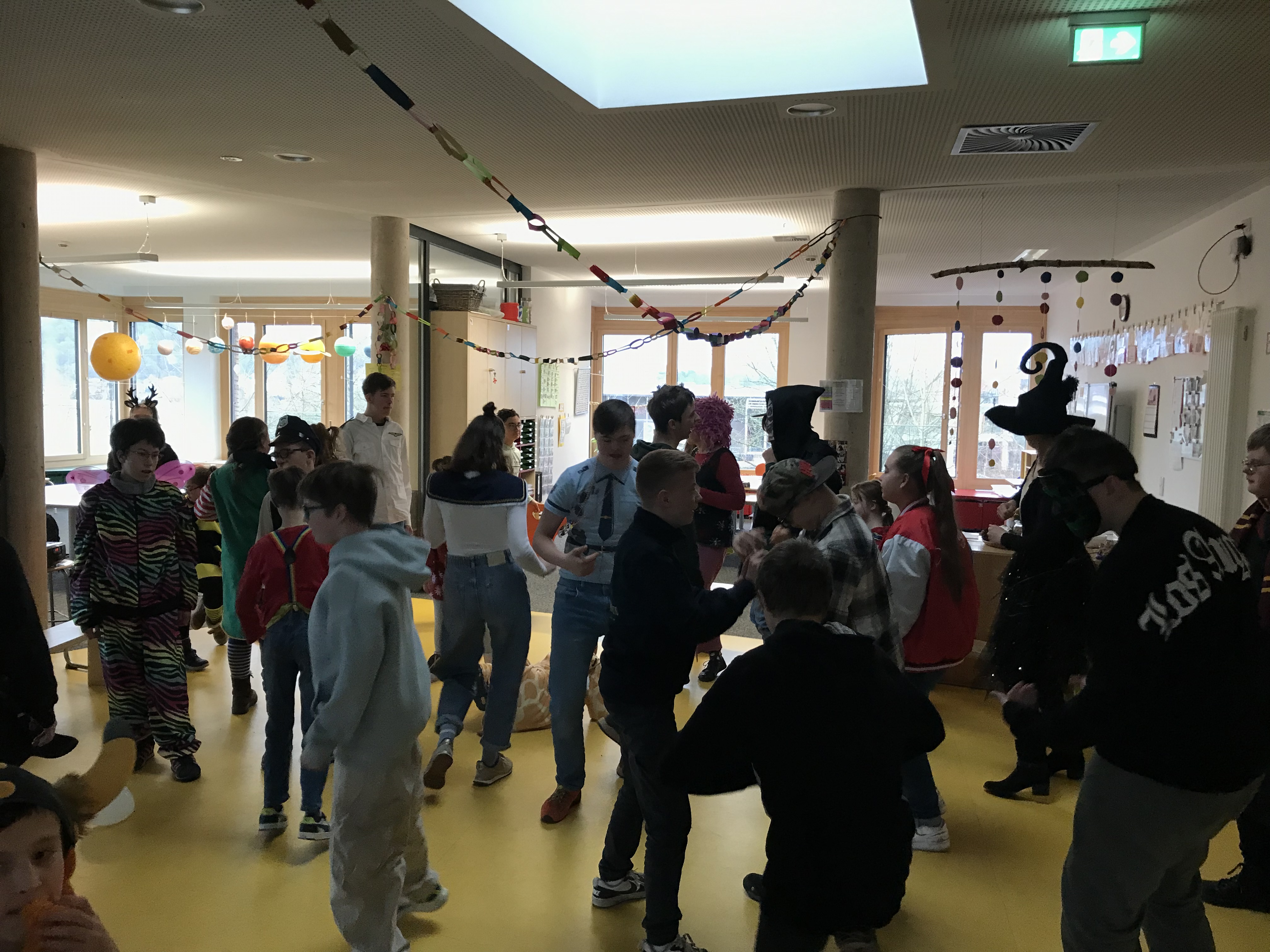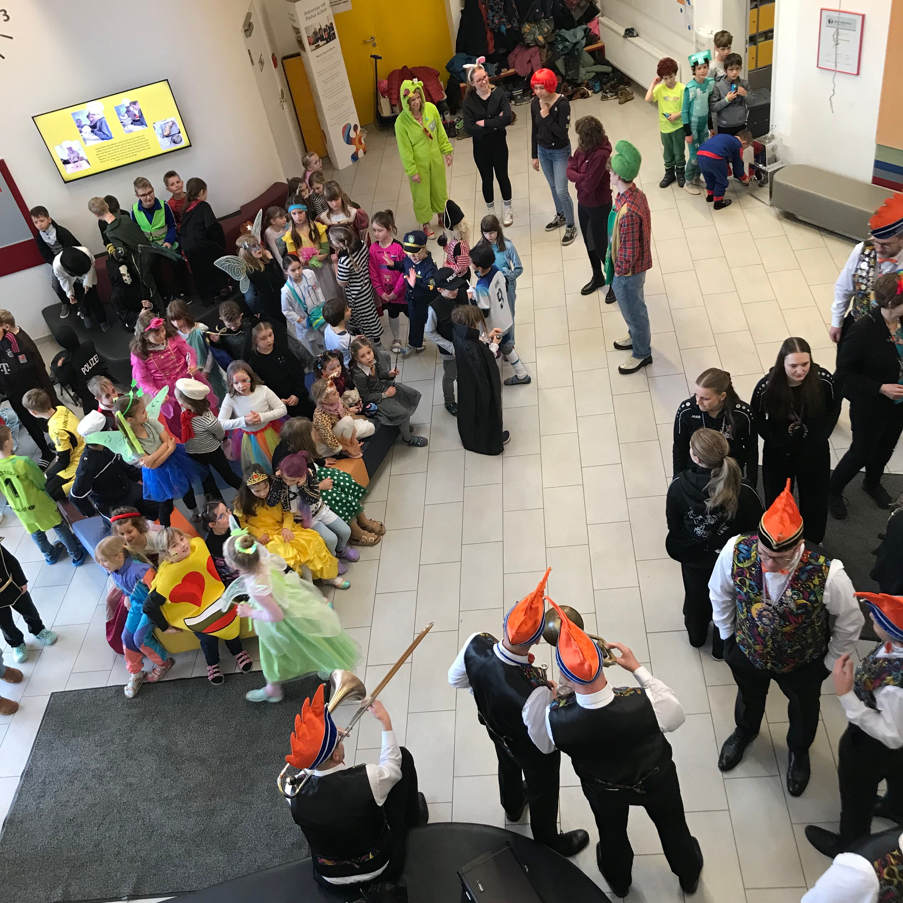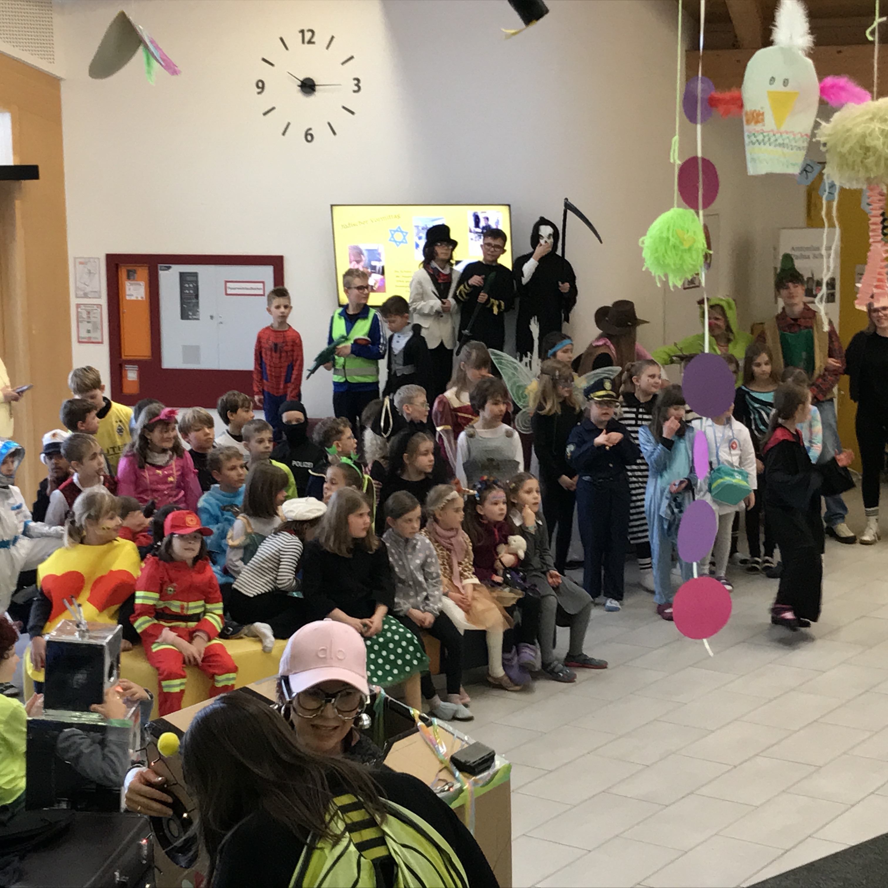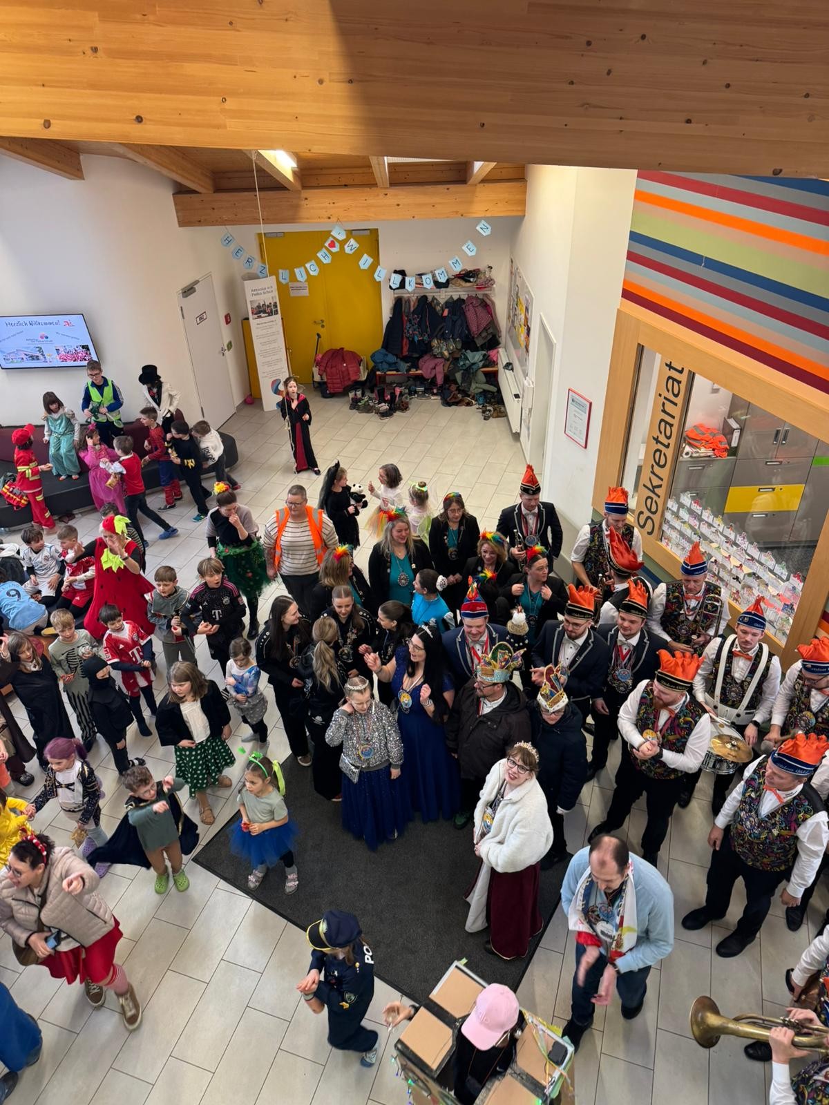 Also feierten wir am Freitag, 13. Februar 2026, im Foyer der Antonius von Padua Schule mit guter Stimmung. Um 10 Uhr wuselten lauter Prinzessinnen, Feen und Piraten in unserer Schule rum und verteilten sich in allen Ecken des Flurs. Aus Platzgründen war die Empore für die Schülerinnen und Schüler der Mittel- und Hauptstufe reserviert, von denen auch ein paar verkleidet waren.